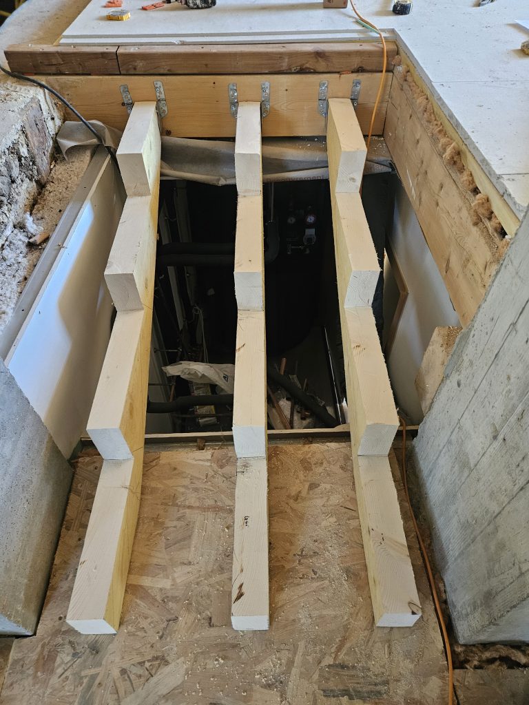 Un peu comme pour la barrière de la plateforme, nous avons voulu sécuriser le tour de la terrasse qui se trouve surélevée. Ici, nous allons fixer des poteaux d’environ un mètre de haut dans les pierres via des platines pour y viser des demi-rondins en bois. Des petits chapeaux en métal viendront se poser sur les poteaux pour les protéger et donner un rendu plus esthétique.