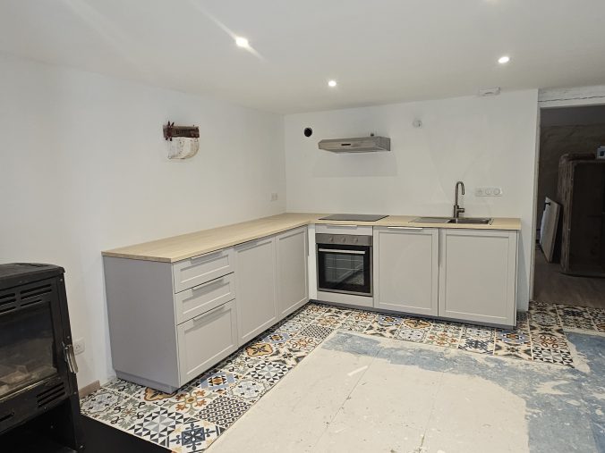 Comme prévue, nous avons monté la cuisine Ikea en août 2025 et le résultat est très satisfaisant. Le montage s’est déroulé sur 3 jours entre le montage des caissons, des tiroirs et le découpage des plans de travail. Il a fallu au préalable poser le carrelage. Pour nos visiteurs, il y aura tout le confort : de gauche à droite;